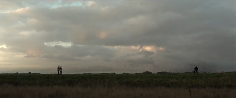叔父さんと二人の間を鳥が群れをなして飛んでいきます。写真の細かい点々が鳥です。