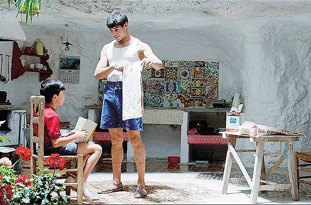 ハシンタ(ペネロペ・クルス)は幼いサルバドールを連れて夫の故郷(かな?)に移ってきます。しかし、そこは洞窟の住まい、ハシンタは驚きつつも気丈に振る舞いサルバドールとの生活を築いていきます。サルバドールは利発な子で読み書きができますので村の若者に読み書きを教える代わりに壁に漆喰を塗りタイルで飾ったりの補修を頼みます。