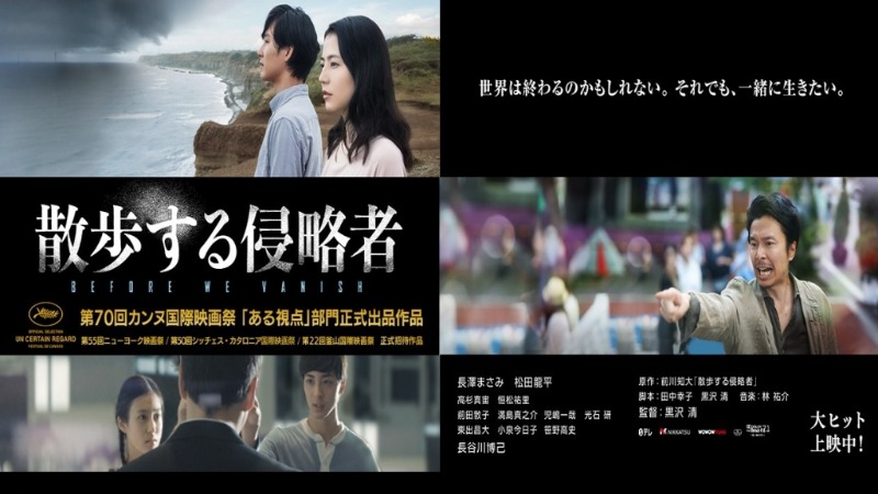 劇団「イキウメ」の舞台をまったく知りませんが、「太陽」ではバイオテロのウィルスによって人口が激減した後の地球の話でしたし、この「散歩する侵略者」も地球を侵略する姿形のない概念のみの宇宙人の話ですし、その基本のネタ自体は、映画であればハリウッドだって取り上げないだろうという陳腐さ(ペコリ)なのに、どうやらかなり評価は高いようで、何かあるには違いないのに、映画の「太陽」ではまったく何も感じられず、おそらく、演劇ですので構成と内容の持つトーンはあまり変わらないだろうと想像でき、仮にこの映画が原作とは異なったものであろうと、きっとその評価の高さの一端が見えるかもしれないとも思ったわけです。