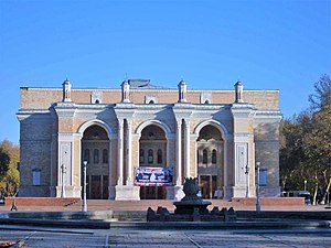 続いて、首都タシケントです。ここでもバザール行きと同様のさまよう葉子が演じられます。恋人への絵葉書を出しに郵便局へ行きますが、やはりここでも無言で済ませます。さらに街をさまよっていますと、歌声が聞こえてきます。誘われるようにその建物「ナヴォイ劇場」へ入っていきます。