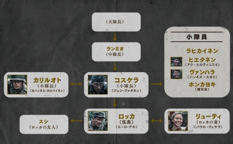 一番目立つのはロッカ(エーロ・アホ)、階級は伍長とか出ていました。経験豊富で勇敢で、上官にもずけずけものをいう人物です。妻と子ども三人、戦争中にもう一人生まれ四人の家族を残して出征しています。冬戦争で自分の土地を奪われたから戦っていると言っていました。